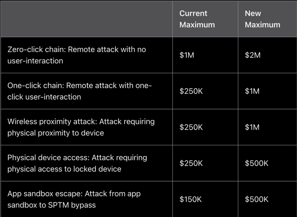 Apple has doubled its top reward from $1 million to $2 million for discovering exploit chains capable of achieving the same goals as advanced mercenary spyware attacks – the kind that require no user interaction.