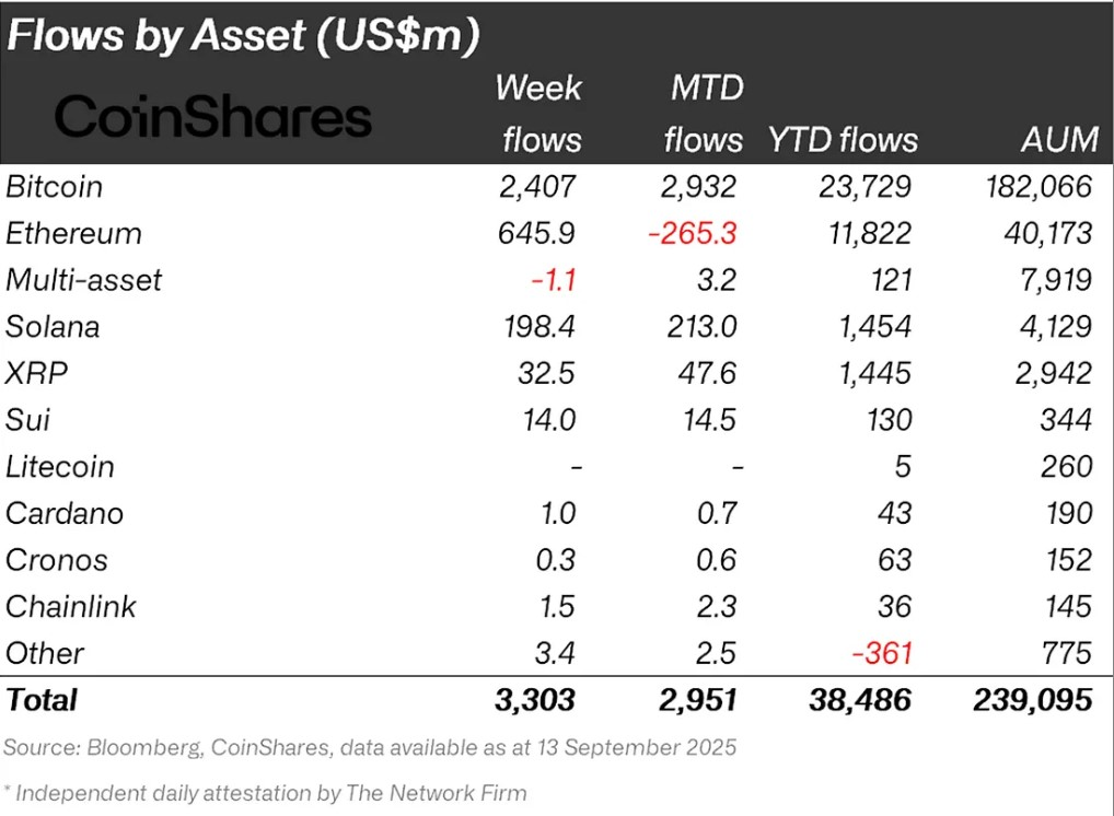 Global crypto ETPs saw $3.3 billion in inflows last week, lifting overall assets under management (AUM) to $239 million, near the record high in August. Last month, crypto ETPs saw an all-time high AUM of $244 billion.