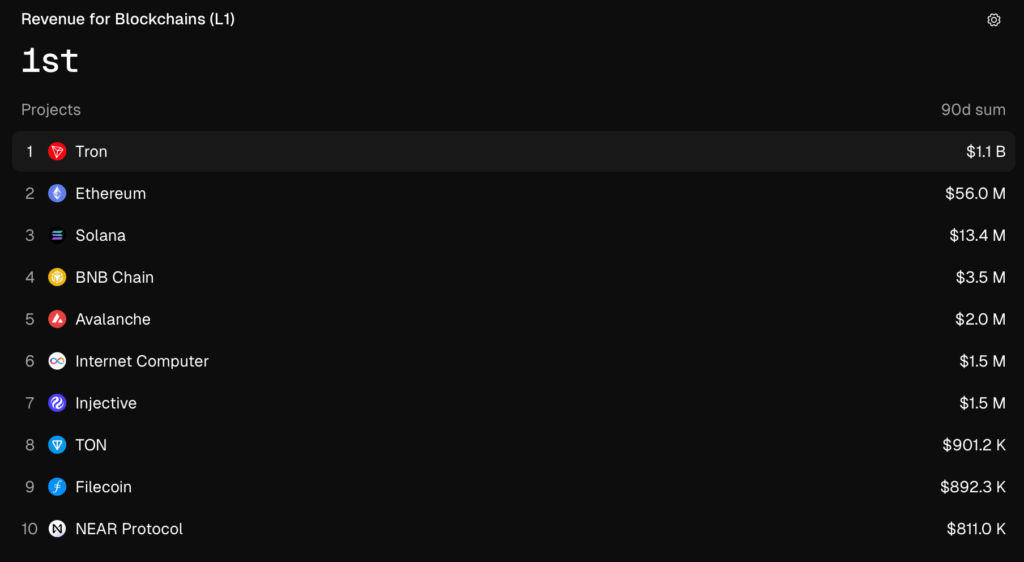Over the past seven days, Tron captured 92.8% of total revenue among layer-1 networks, ahead of Ethereum, Solana, BNB Chain and Avalanche. Fees generated from transactions on Tron amounted to $1.1 billion over the past 90 days.